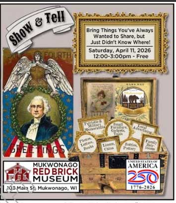 Join Mukwonago area folks to kick off the 250th Anniversary Celebration of the USA and the 190th of Mukwonago! The Mukwonago Historical Society is hosting a “SHOW & TELL”‘ event!